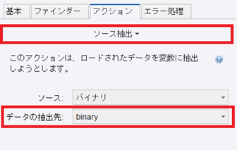 2.アクションステップを作成し、「ページ読込⇒ソースの抽出」を選択し、以下のようにデータの抽出先をbinaryに変更し、いったんDS上の変数にダウンロードファイルを取り込みます。