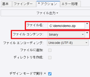 3.アクションステップを作成し、「ファイルシステム⇒ファイル出力」を選択し、ファイル名に任意の場所を指定し、ファイルコンテンツをbinaryに変更します。